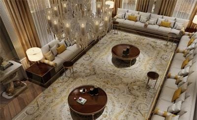 اعتمد مصممو الديكور في صناعة هذا المجلس الفخم على عمل أريكتين متصلتين باللون الأخضر وقد تم إضافة اللون الذهبي الأنيق مما يمنح المجلس رونقًا وجمالًا خاصًا، كما تم تصنيع الطاولات السداسية الشكل من الخشب الزان بنفس اللون الأخضر المبهر وتم وضع طبقة من الزجاج الفاخر عليها مما يمنحها شكلًا كلاسيكيًا فاخرًا.